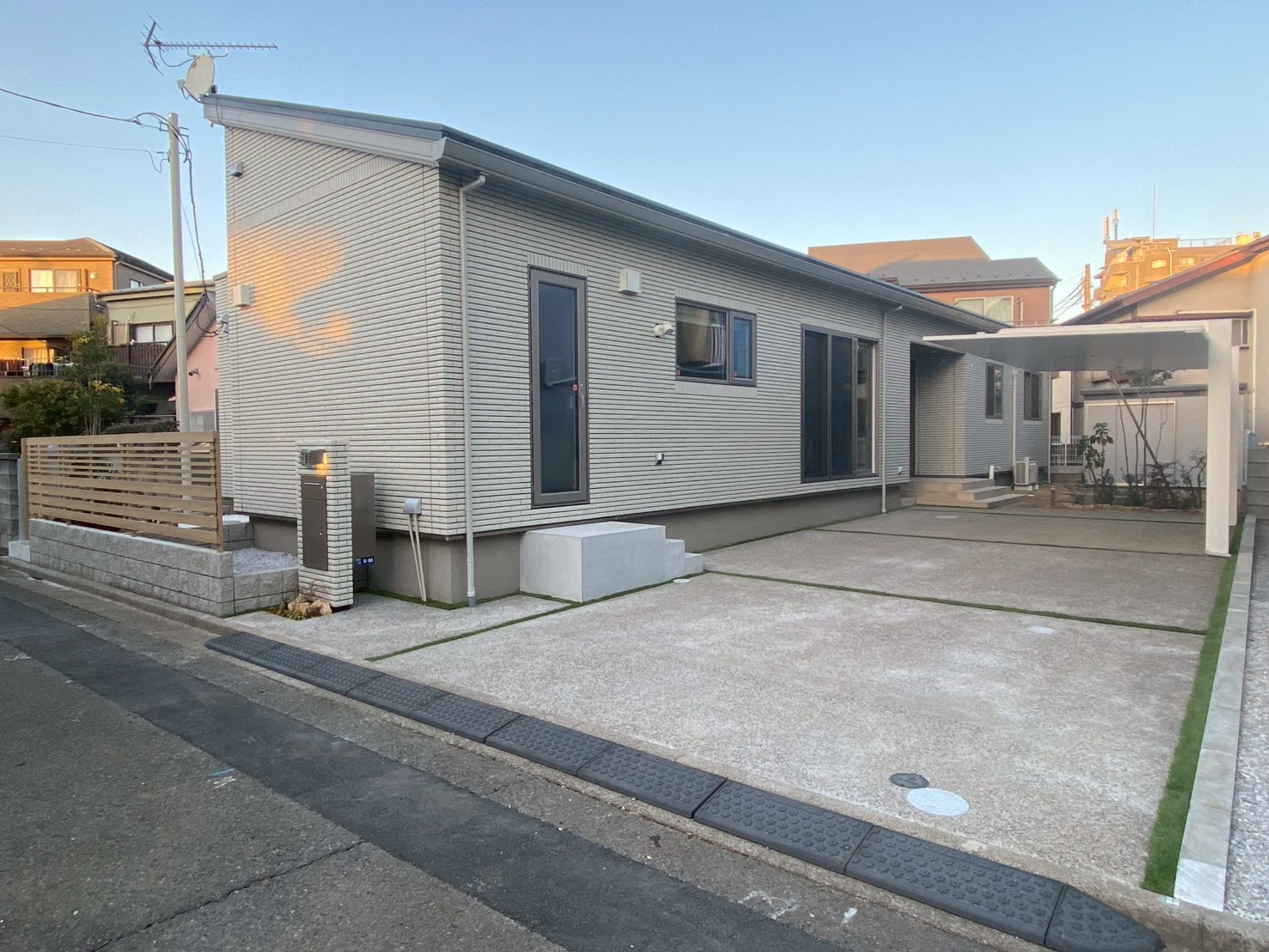 2023年12月 埼玉県吉川市 A様邸 今回のエクステリア工事は埼玉県吉川市のA様邸。 フェンス取付、駐車スペースの土間コンクリート打設 インターロッキング等をお任せいただきました! 植栽スペースを確保し、楽しみが広がるオープン外構です。 人気のスマート宅配BOXは便利な機能が詰まっています! 玄関へと続く直線的なアプローチには 大きめのインターロッキングがしっくりきますね。