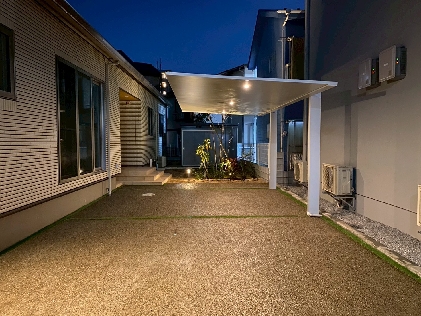 2021年10月 ふじみ野市 U様邸 車3台が楽々停められるカーポート。 化粧パネルが目立って印象的ですね! 夜はライトが付き明るさも確保しています。 駐車スペースのスタンプコンクリートで石畳を表現しました。