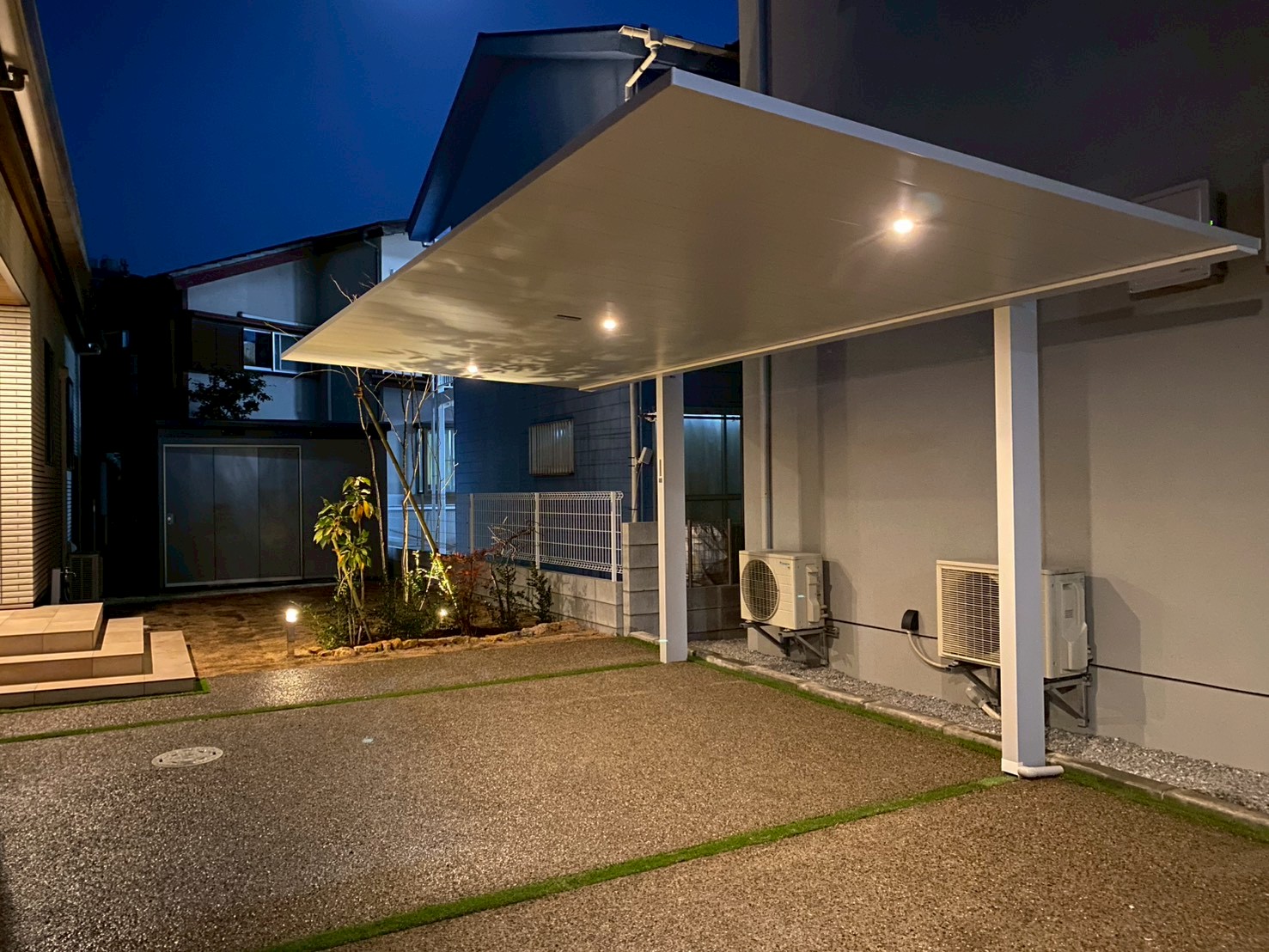2026年12月 埼玉県川越市 K様邸 今回のエクステリア工事は埼玉県川越市のK様邸 【作業内容】 土間コンクリート打設・カーポート設置・浮遊ステップ カーポート設置・人工芝・物置設置・タイル張り・植栽_他 ゴルフの練習用に人工芝の高さを切り替えて施工しました。 縦連棟のカーポートは存在感抜群です! 手摺下にラインライトを仕込み、夜間も美しさを添えています。