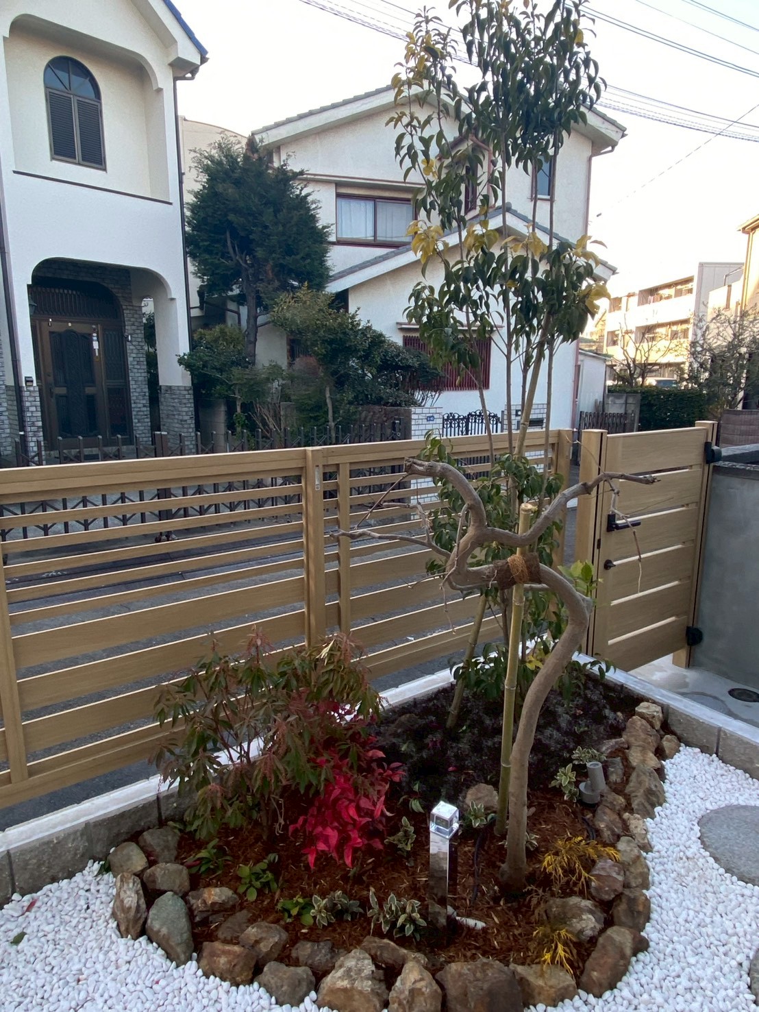 2022年10月 川越市 M様邸 HIKARIキャンペーンのウッドデッキをプレゼントさせて頂いたお客様お二人目です! デッキ下を砂利にして雑草対策をしております。 道路側に植栽を植えてもお庭が引き立ちますね!